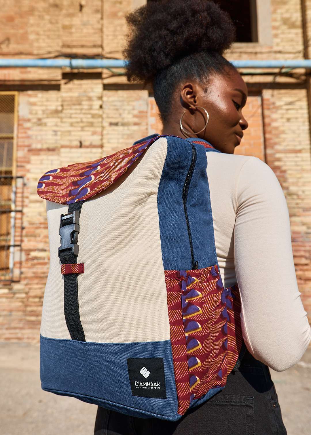 Mochila loneta combinada con con fragmentos de tela wax. Cierre de tapeta en la parte frontal y cremallera interior. Dispone de un bolsillo antirrobo con cierre de cremallera en la parte trasera. Compartimientos en los laterales. Asa de mano y dos asas de hombro ajustables y acolchadas. Compartimiento para ordenador en el interior.