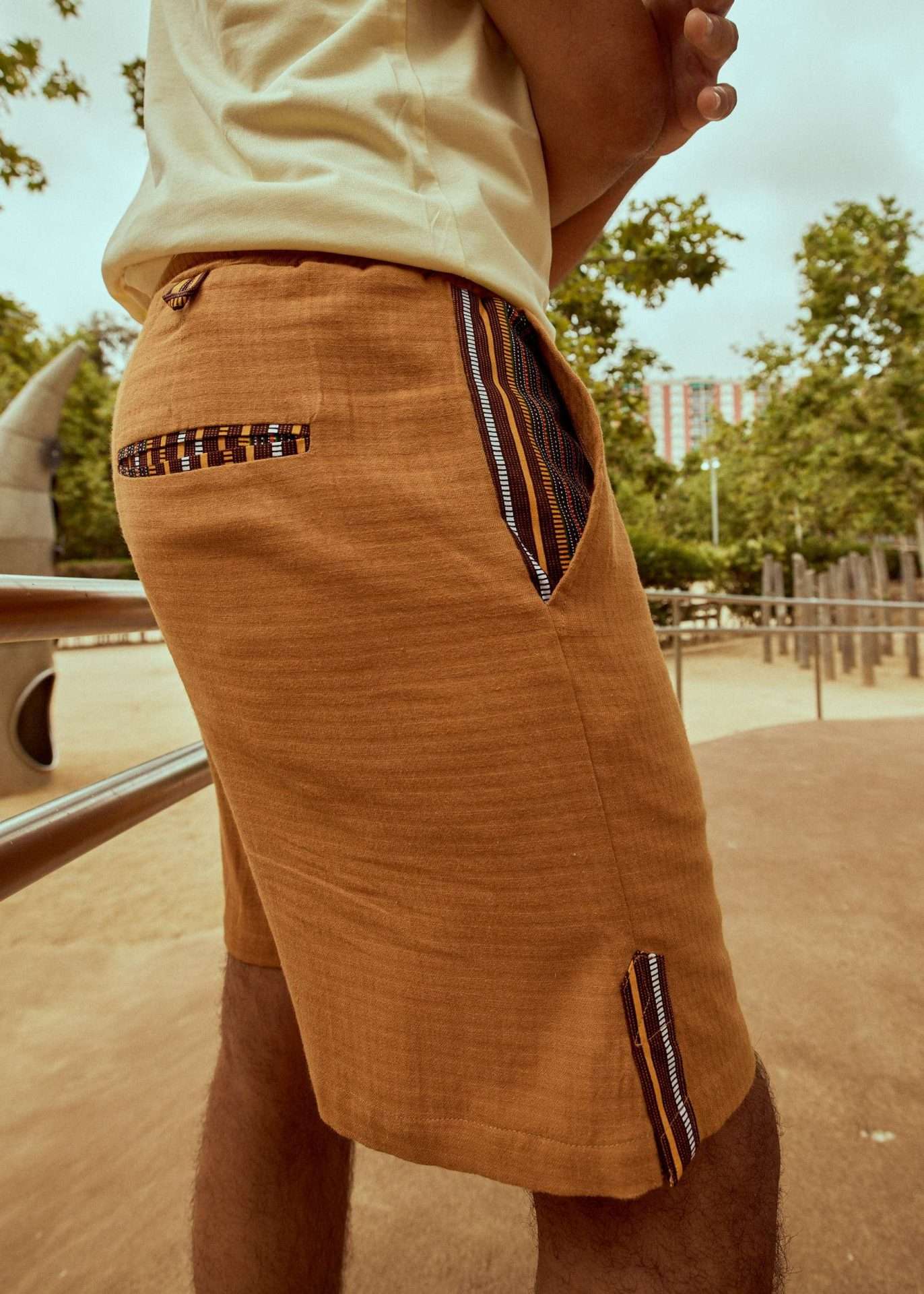 Bermuda confeccionada en tejido de algodón reciclado y lyocell de diseño utilitario. Cintura elástica ajustable. Bolsillos delanteros plastrón con solapa. Apliques en tejido algodón wax en solapa de bolsillos, interior de bolsillos laterales, cinturilla y vivo en el trasero.
