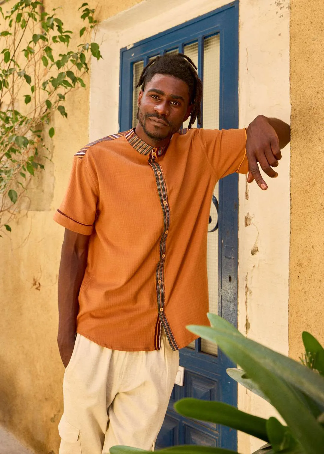 Camisa silueta relajada confeccionada en tejido de algodón orgánico con efecto textura. Cuello mao y manga corta con detalle. Cierre frontal de botonadura.