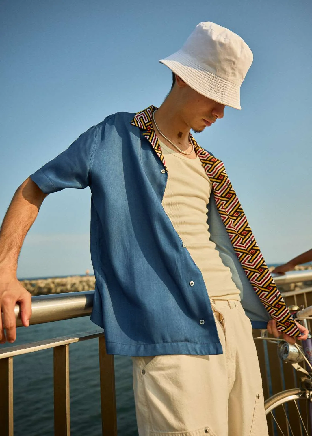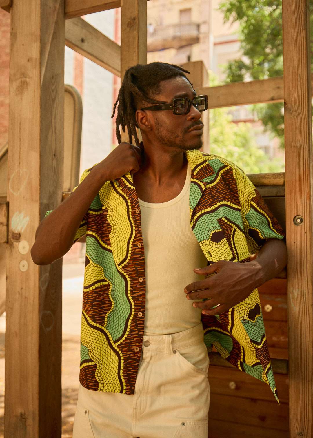 Camisa de silueta relajada con efecto denim. Cuello bowling, manga corta y cierre frontal de botonadura. Apliques de tejido wax (africano) en contraste en cuello y bolsillo.