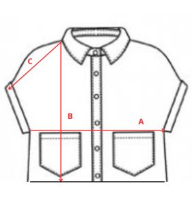 C – Largo de hombro/manga: Es la medida de la camisa desde inicio de cuello, pasando por hombro hasta el final de manga.