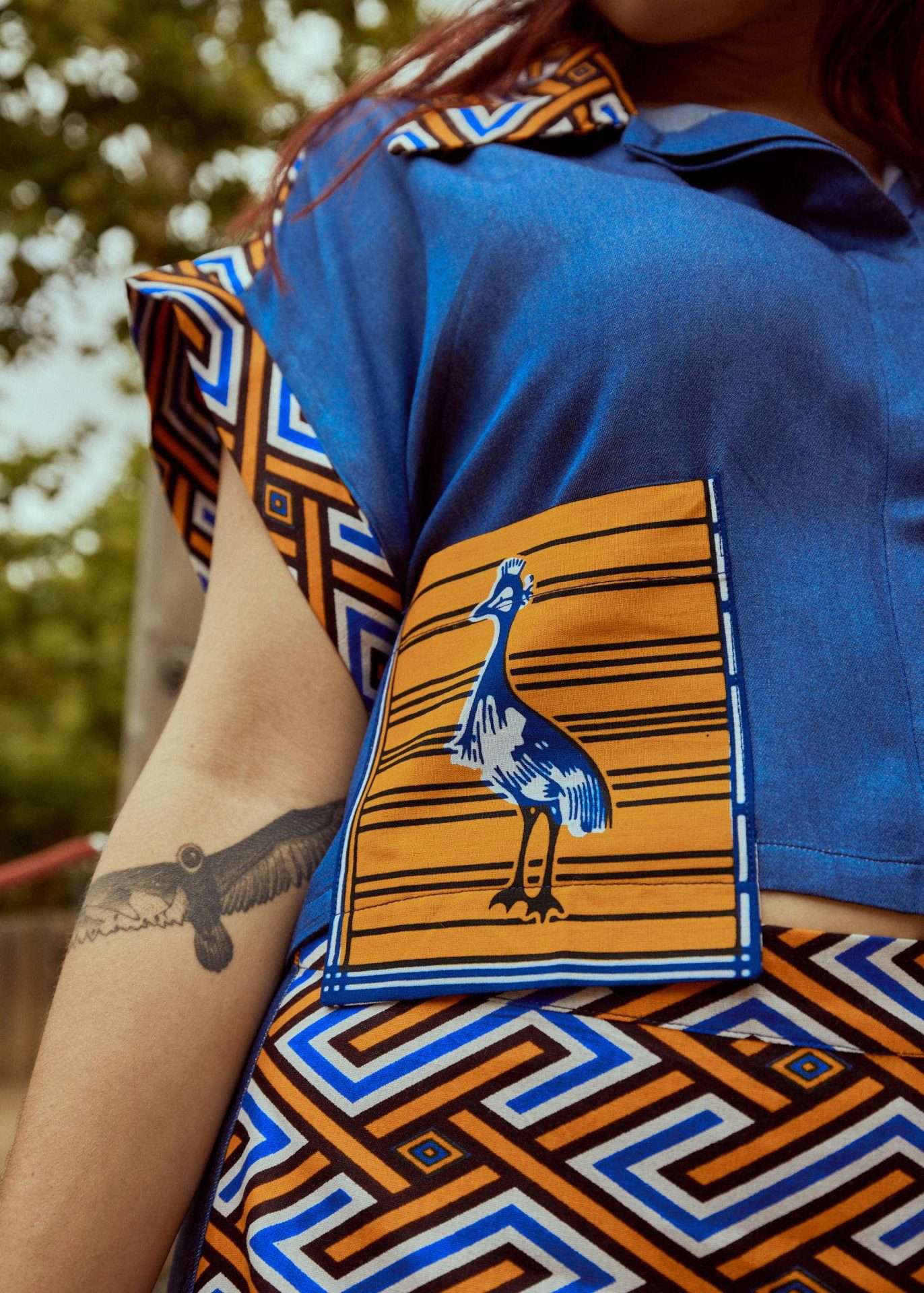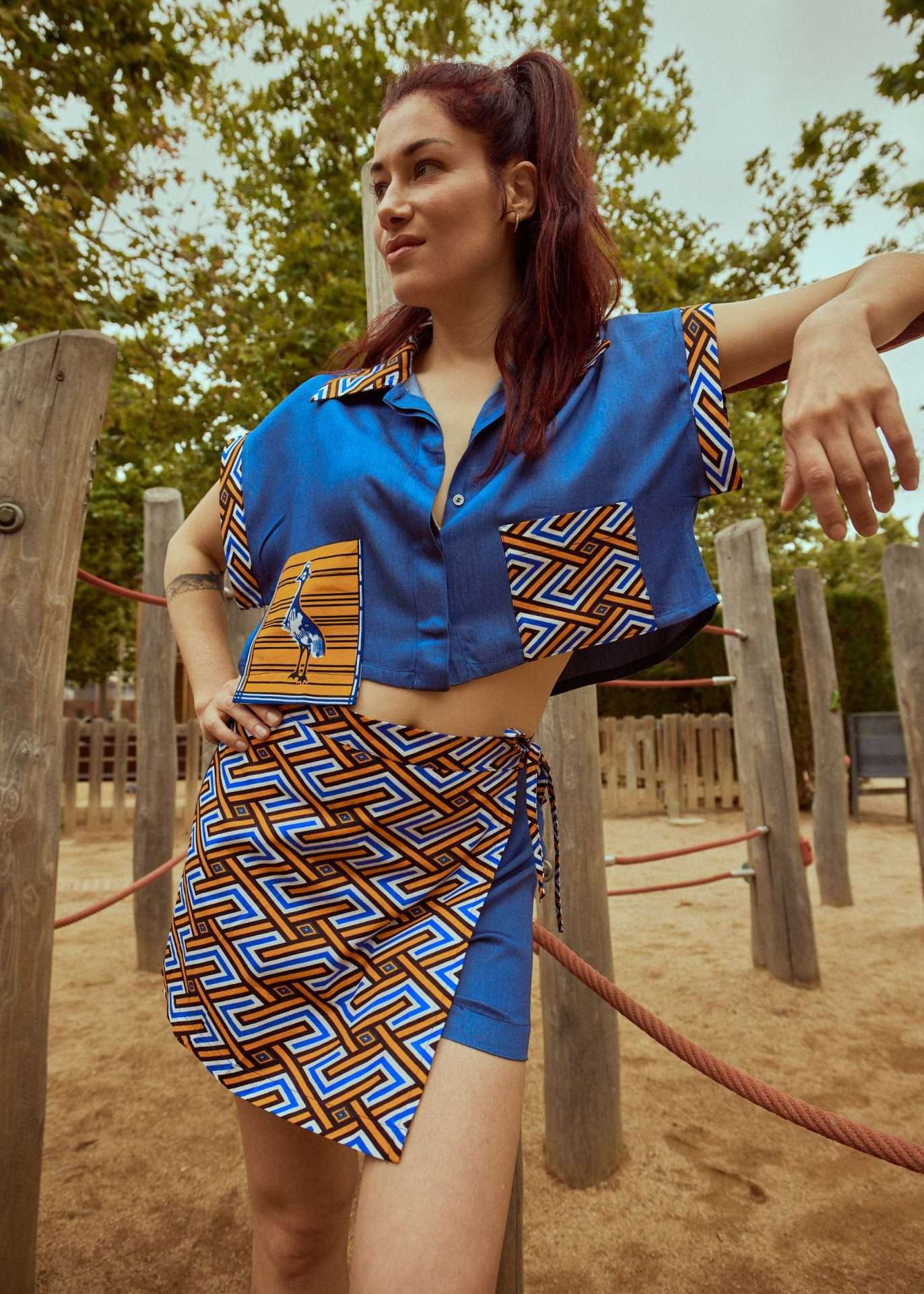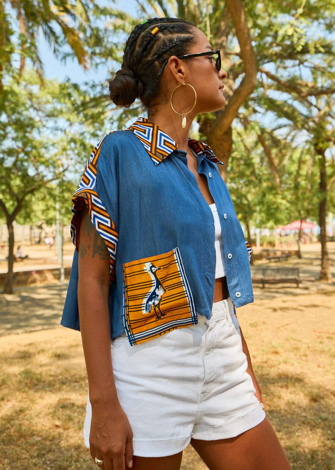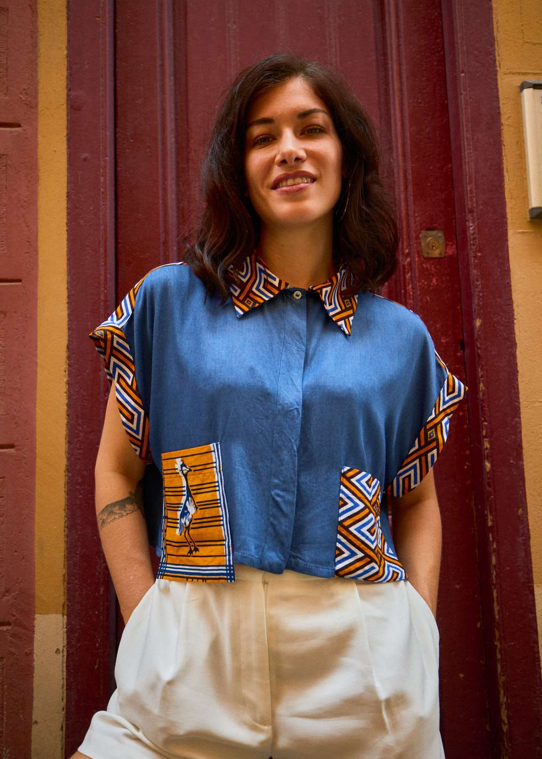 Detalle en manga, cuello, canesú y bolsillos en tejido wax 100% algodón.