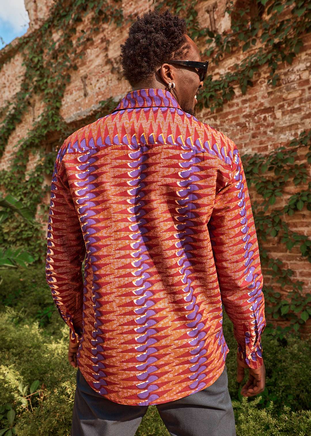 Camisa regular fit con cuello camisero en tejido wax (africano) algodón 100%. Cierre frontal de botonadura y manga larga.