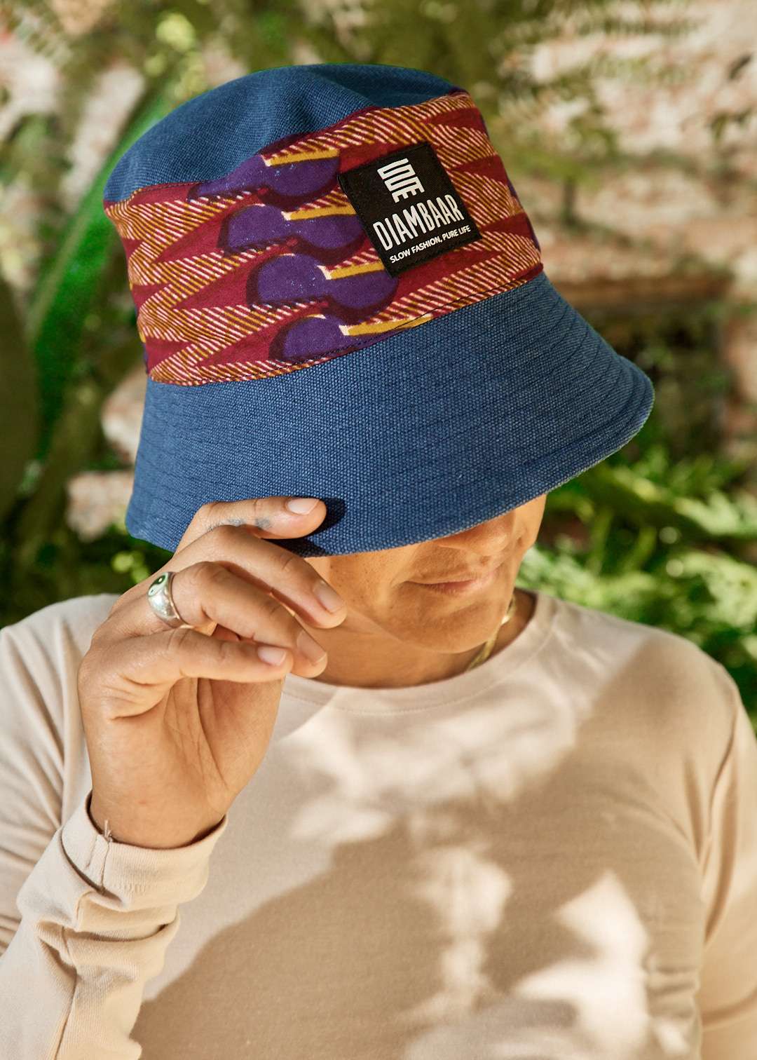 Sombrero pescador confeccionado con loneta algodón y tela wax. Forro interior también en wax. Visera 360º y flexible. Viene en 2 tallas. Logotipo de Diambaar cosido en el frontal.