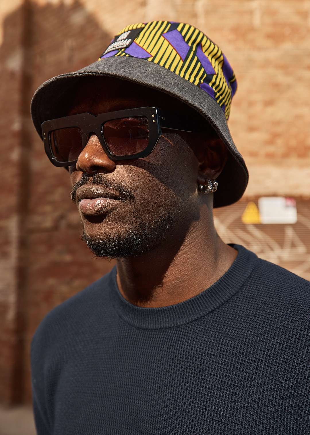 Sombrero pescador confeccionado con loneta algodón y tela wax. Forro interior también en wax. Visera 360º y flexible. Viene en 2 tallas. Logotipo de Diambaar cosido en el frontal.