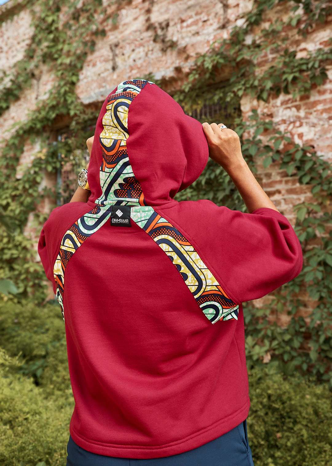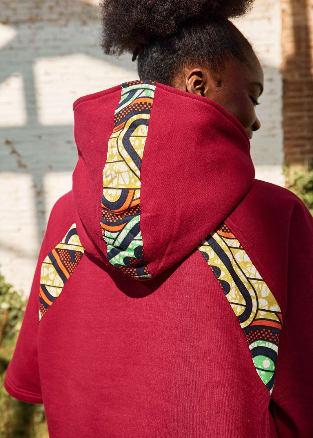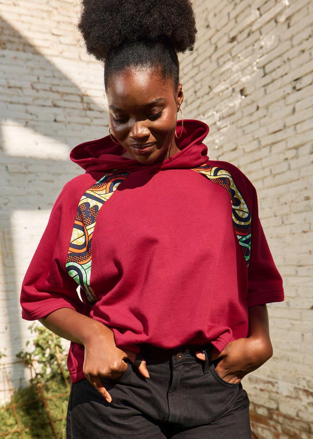 Sudadera crop de algodón con capucha en color granate y detalles de diseño en tejido wax. Manga 3/4.