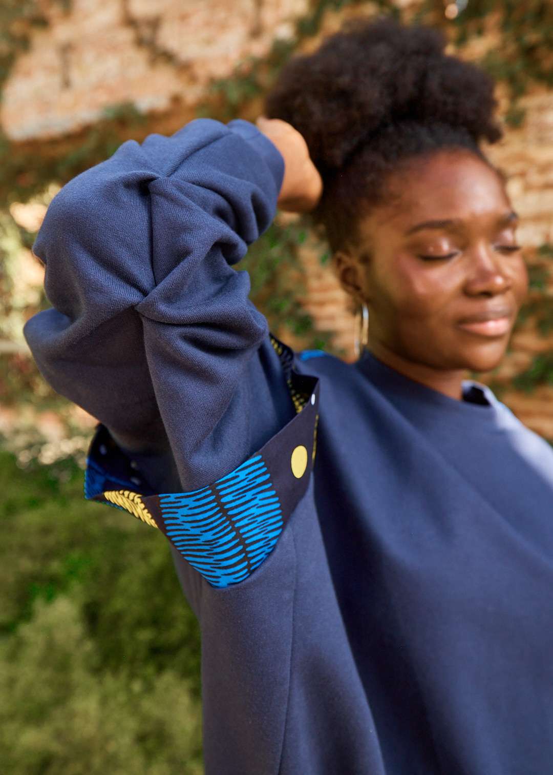 Sudadera oversize de algodón color marino con detalles en tejido wax y volumen en mangas abullonadas. Cuello redondo y fruncido en bajos. Modelo de hombros caídos con cuello, puños en punto canalé.